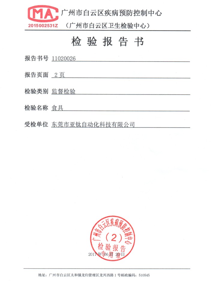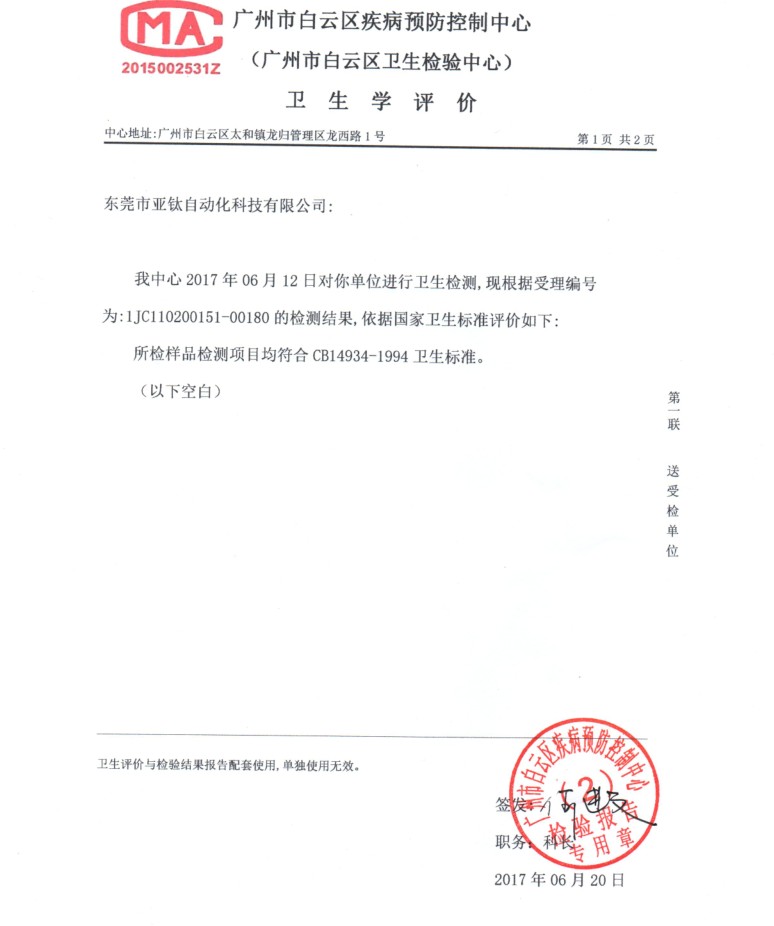 恭喜亞鈦?zhàn)詣?dòng)化通過廣州市疾病預(yù)防控制中心檢驗(yàn)