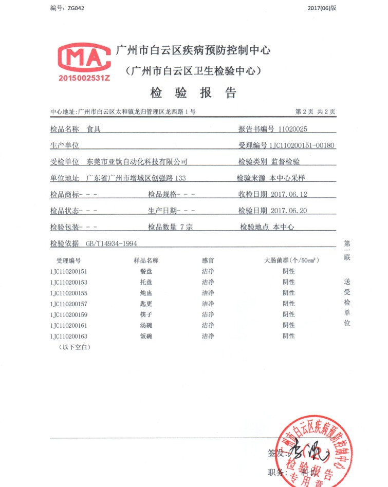 恭喜亞鈦?zhàn)詣?dòng)化通過廣州市疾病預(yù)防控制中心檢驗(yàn):真正放心商用洗碗機(jī)