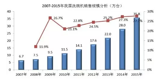 2006年我國商用洗碗機市場規(guī)模為1.89萬臺,2007年達到2.52萬臺,同比增長33.33%,2008年為2.80萬臺,同比增長率為11.11%,2009年為3.29萬臺,同比增長率為17.65%,2010年為4.70萬臺,同比增長率為42.86%。預計到2015年,我國洗碗機的銷售規(guī)模將達到35.8萬臺。