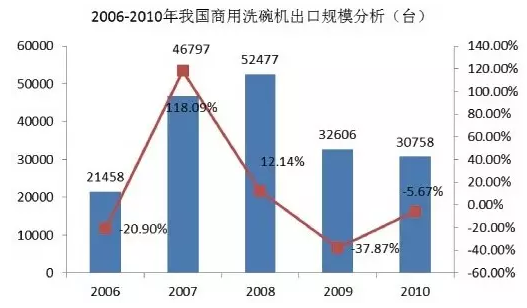 2006年我國商用洗碗機出口規(guī)模達到21458臺,2007年我國商用洗碗機出口為46797臺,同比增長率達到118.09%,2008年達到達到52477臺,同比增長幅度有一定的下降,2009年、2010年因金融危機的影響,我國商用洗碗機的出口量有較大幅度的下降,分別為32606臺、30758臺,下降比例分別為37.87%、5.67%。