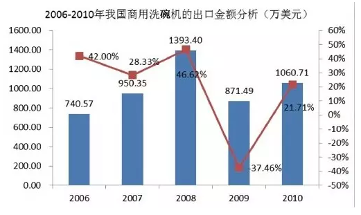 2006年我國商用洗碗機的出口金額為740.57萬美元,同比增長率達到42%,2007年為950.35萬美元,同比增長率為28.33%,金額的增長幅度較數(shù)量的增長幅度小很多,主要原因是商用洗碗機的出口單價從2006年的345美元/臺下降為203美元/臺。2008年出口金額為1393.40萬美元,同比增長46.62%,2010年出口金額有所回升,為1060.71萬美元,增長率為21.71%。