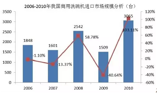 2006年我國商用洗碗機的進口規(guī)模為1848臺,同比下降1.1%,2007年為1601臺,同比下降13.37%,2008年該規(guī)模上升到2542臺,同比增長率達到58.78%,受金融危機影響,2009年我國商用洗碗機出口量減少到1509臺,同比下降40.64%,隨著經(jīng)濟的復蘇,2010年我國商用洗碗機進口規(guī)模達到3065臺,同比增長率達到103.11%