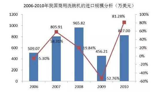 2006年我國商用洗碗機的進口金額為509.07萬美元,同比下降5.3%,2007年上升為805.91萬美元,同比增長幅度達到58.31%,2008年達到965.82萬美元,同比增長率達到19.84%,受金融危機影響,進口金額規(guī)模下降為456.21萬美元,下降幅度達到52.76%,2010年經(jīng)濟開始復蘇,我國商用洗碗機的進口規(guī)模達到827萬美元,同比增長81.28%。